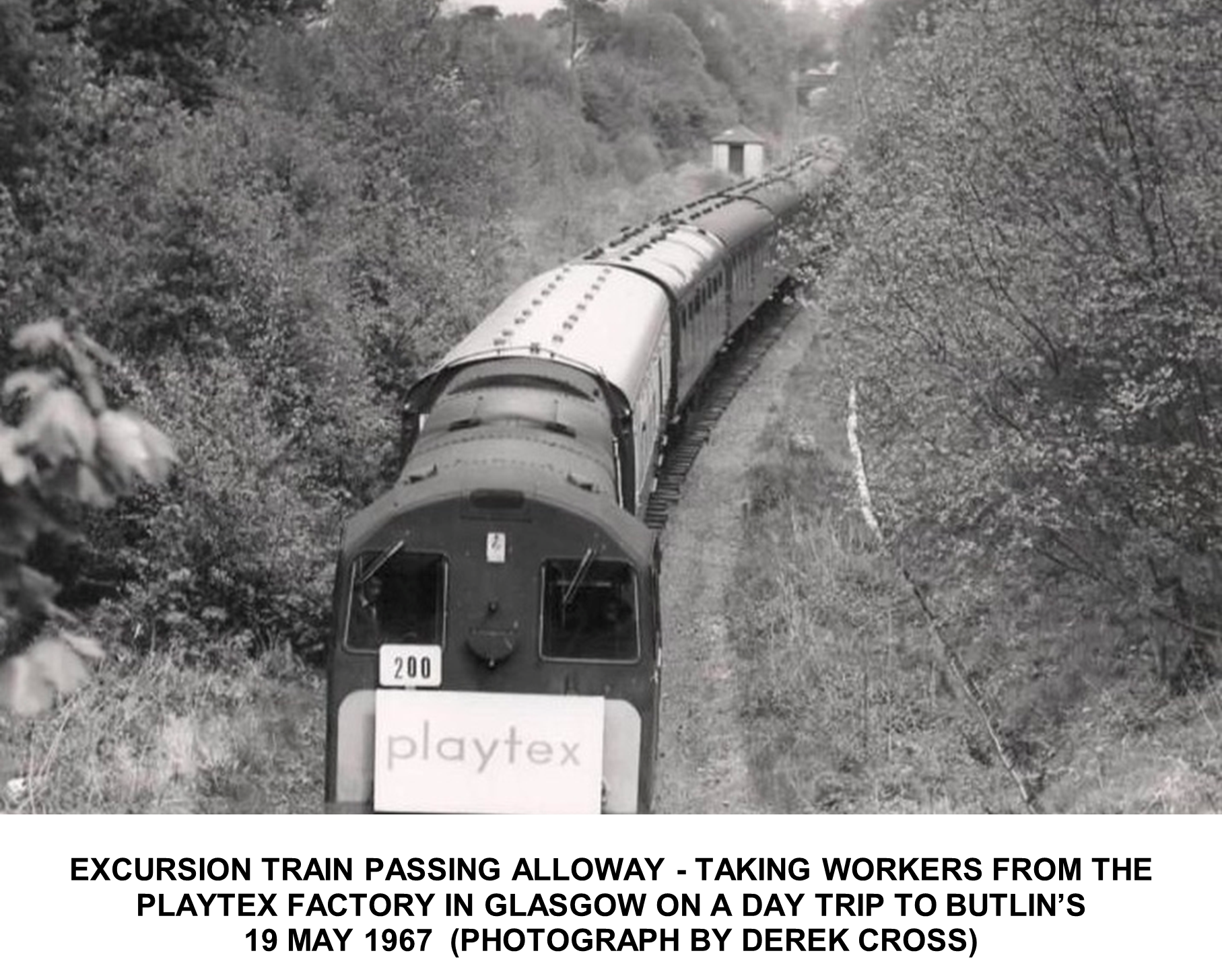 As well as transporting holidaymakers to Butlin’s, excursion trains were a regular feature on the line. They brought people from Ayr or further afield, mainly from Glasgow or the Central Belt of Scotland, to Butlin’s for a day trip. They were particularly popular with groups of workers who had the chance to enjoy a day out at Heads of Ayr. Photograph 10 shows Locomotive English Electric 1000 hp diesel Number D 8020 taking workers from the Playtex women’s clothing company on a day trip to Butlin’s.